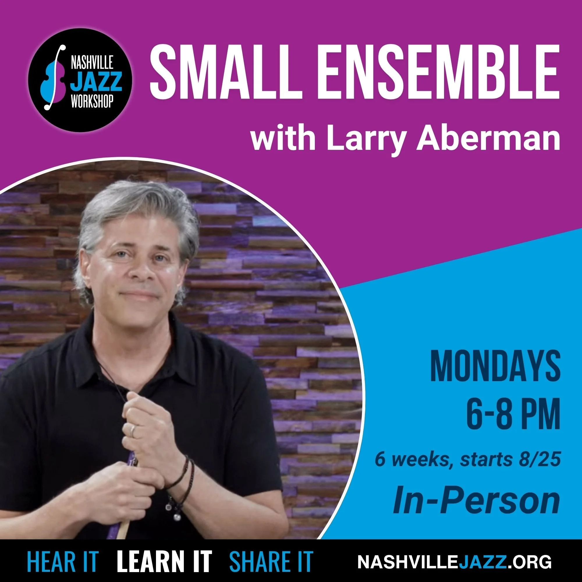 Back to All Events Small Ensemble with Larry Aberman - 8/25-9/29 Monday, August 25, 2025 6:00 PM Wednesday, September 24, 2025 8:00 PM Google Calendar ICS MONDAYS, 6-8PMIN-PERSON, 6 WEEKS8/25-9/29$360This intermediate to advanced ensemble is open to all instrumentalists. Students will cover more advanced concepts of literature, including intros, endings, styles, tempos and comping. REGISTER